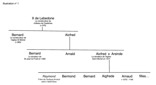 « l’église de Saint-Michel qui est, dans ma place forte, à l’endroit incontestablement chef-lieu le plus important de mon honneur, à savoir le Castelnau que Bernard, mon oncle (ou grand-oncle), fit construire naguère pour la vie commune des clercs ».