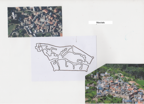 L’enceinte de Marzials, épaisse de 1,4 m, avec ses tours rondes, témoigne de remaniements postérieurs au XIIe siècle, comme celle de Castelnau édifiée pendant la guerre de cent ans ; néanmoins elle fournit l’indication de l’emprise initiale de 140 m par 70, qui fit l’objet du procès entre Cardone, veuve de Levezou, et Bermond de Levezou, c’est un peu plus que la moitié de l’espace homologue de la ville de Montjaux.
