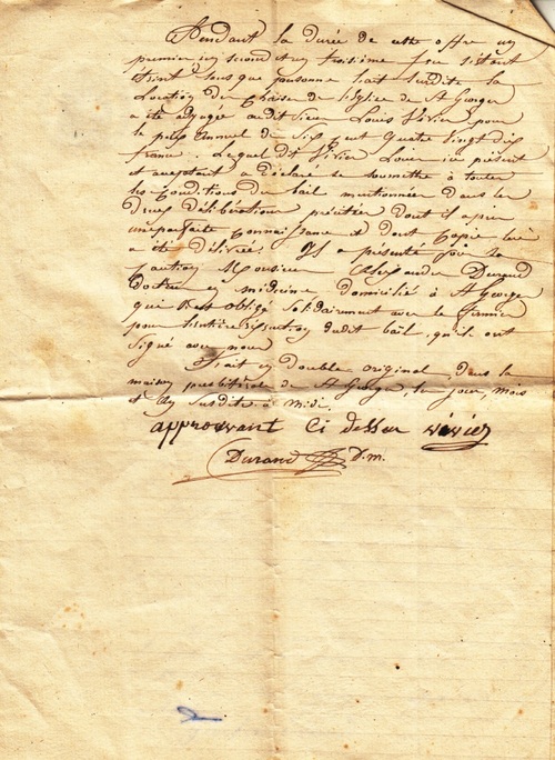Il a présenté pour sa caution Monsieur Alexandre DURAND, docteur en médecine domicilié à St-George qui s’est obligé solidairement avec le fermier pour l’entière exécution dudit bail, qu’ils ont signé avec nous.
