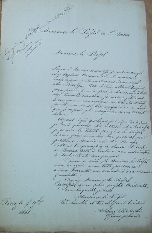 l’officier Albert Rozecki se plaint amèrement de souffrir de « nostalgie », au point que cet état de désespoir moral, affecte sa santé et après six vaines années passées dans le commerce, lui interdit « d’entreprendre aucun travail sérieux » ; ceci l’amène à demander l’autorisation de s’inscrire à l’Ecole des Beaux-Arts de Toulouse, dont l’atmosphère conviendra sans doute bien mieux à sa détresse romantique tellement en phase avec son époque.