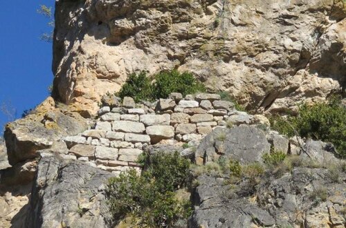 On peut observer des restes de murs de soutènement sur deux gros rochers contigus, dont l’un surplombe la D 159, qui a sans doute remplacé l’ancien chemin : des murettes, qui vraisemblablement permettaient de se déplacer d’un rocher à l’autre ou peut-être d’éviter des ascensions depuis leur pied. Pour autant, on imagine difficilement un château à cet endroit, car on ne voit sur les rochers eux-mêmes, de faible surface, aucun aménagement, pas la moindre trace de maçonnerie. Peut-être le château était-il appuyé contre les rochers, comme celui de Peyrelade, sur la commune de Rivière-sur-Tarn ? Par ailleurs, nous avons pu observer la base d’un mur au pied du rocher qui domine la route ; apparemment, le rocher a été entaillé pour permettre le passage de celle-ci et ce mur s’arrête brutalement.