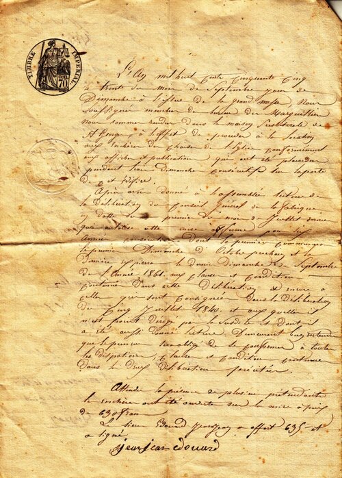 L’an mil huit cent cinquante cinq le trente du mois de septembre, jour de dimanche à l’issue de la grand messe, nous soussignés, membres du bureau des marguilliers nous sommes rendus dans la maison presbytérale de St-Georges, à l’effet de procéder à la location aux enchères du chaisier de l’église conformément aux affiches et publications qui ont été placardées pendant trois dimanches consécutifs sur la porte de cet édifice.