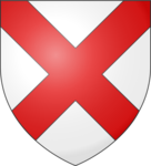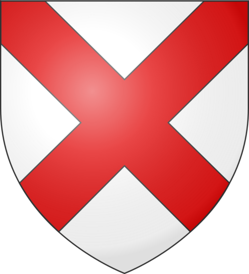 - On accédait à la tour au niveau du premier étage, comme c’était en général le cas pour les donjons. A ce niveau, la porte d’entrée (au haut d’un escalier actuel en pierre) est surmontée de l’écusson des Panat, qui est comme on l’a dit d’argent au sautoir de gueules (c’est à dire une croix de Saint-André rouge sur fond blanc).