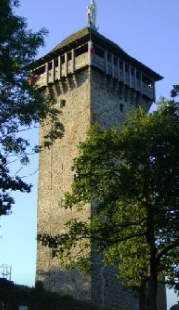 - La tour a, ou plutôt avait, cinq étages voûtés. Elle est encore couronnée par les corbeaux qui supportaient jadis les mâchicoulis.