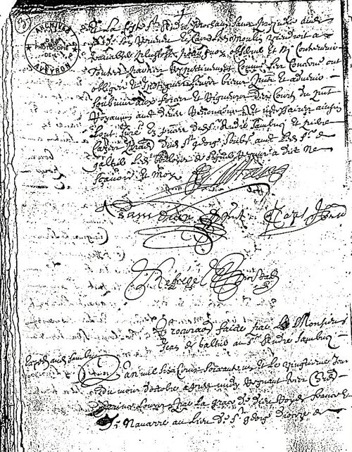 L’an mil six cent soixante un, et le dix-neuvième jour du mois d’octobre avant midi, régnant très chrétien prince Louis, par la grâce de Dieu Roy de France et de Navarre, au lieu de St-George, diocèse de Vabre en Rouergue, maison de moy notaire royal héréditaire en seul du dit St-George, soussignés par devant moy notaire et témoins bas nommés, était Monsieur Messire Jean de Galtier, conseiller du Roy en la cour des Aydes et finances de Cahors, que de gré a donné à prix fait à Laurens Boulouys, à présent meunier dudit St-George, ici présent et acceptant,