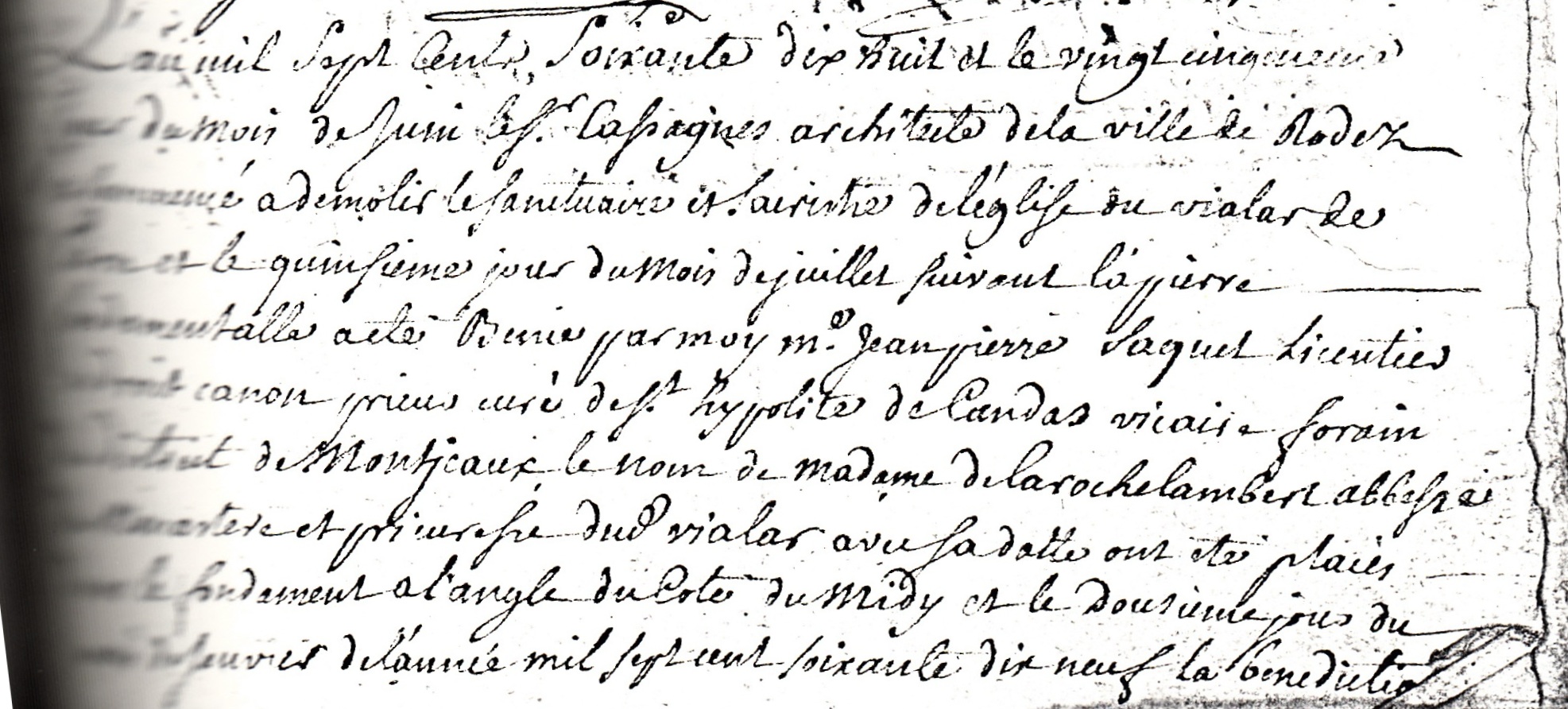L’An mil sept cents Soixante dix huit et le vingt cinquième jour du mois de juin le sieur CASIAGNES architecte de la ville de Rodez, a commencé à démolir le sanctuaire et sacristie de l’église du Vialar de Tarn et le quinzième jour du mois de juillet suivant la pierre fondamentale a été bénie par moy M°Jean pierre SAQUET, licencié en droit canon prieur curé de St-Hypolite de Candas vicaire forain habitant de Montjaux.
