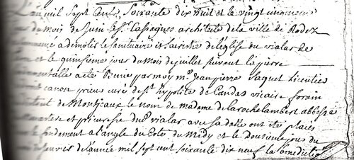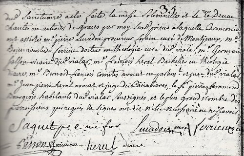 Le nom de madame de LAROCHE-LAMBERT abbesse du Monastère et prieuresse dudit Vialar avec sa date ont été placés dans le fondement à l’angle du côté du midy et le douzième jour du mois de janvier de l’année mil sept cent soixante dix neuf la bénédiction dudit sanctuaire a été faite, la messe solennelle et le Te Deum chanté en actions de graces par moy susdit prieur à laquelle cérémonie ont assisté M° Pierre LUCADOU, procureur forain, curé de Montjaux, M° Bonnaventure FERRIEU, docteur en Théologie, curé dudit Vialar, M° Germain SALSON, vicaire dudit Vialar, M° François HERAL, bachelier en Théologie, diacre, M° Bernard-François COMITIS, avocat en parlement et juge dudit Vialar, M° Jean-Pierre HERAL, avocat et juge des Canabières, le sieur Pierre FARAMOND, bourgeois, habitants dudit Vialar, soussignés et le plus grand nombre des paroissiens qui requis de signer ont dit n’être nécessaire ou ne scavoir