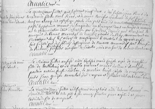 Le quatorzième juillet mil sept cent vingt deux a été fusillé Jean RUAS, de la Cadenède, fils de Noel RUAS et de Marie BONNEFOUS et inhumé le susdit jour dans un champ dit Costefrege, proche d’un petit bois, dit monterbois, à Aluech, pour avoir passé les coteaux venant du Languedoc en Rouergue dans un temps de contagion ou la communication était défendue par les ordres donnés par Monsieur le marquis de BONAS , maréchal de camp es armées du Roy, commandant en Rouergue sous les ordres de Monseigneur le Maréchal de WERVIK et fut fait fusillé par des soldats du régiment de Navarre commandé par Mr de RICHAUD, capitaine
