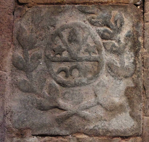 Ces armes ne sont à ma connaissance pas encore identifiées. Ce sont très certainement celles d’une famille bourgeoise, n’étant pas timbrées d’un casque ou d’une couronne, mais simplement entourées de feuillages.