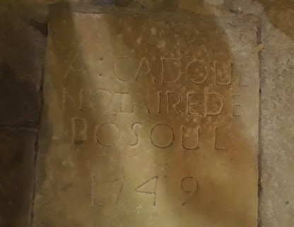 Concernant l’identification du notaire en question, les archives départementales de l’Aveyron conservent les minutes d’un Me Antoine CADOUL, notaire de Bozouls, de janvier 1733 à janvier 1759, soit dix ans après la date portée sur la dalle. Par ailleurs, la base de données Geneaubrac indique à Bozouls le décès à 70 ans d’un Me Antoine CADOUL, notaire, le 26/12/1772. De toute évidence, la pierre tombale de l’église ne concerne pas le notaire dont les minutes sont conservées aux archives départementales ; s’agit-il d’un parent, son père peut-être, dont les minutes n’auraient pas été versées aux archives départementales ?