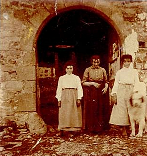 Et la veuve Barthe , la sympathique fermière, et sa nombreuse famille se désolent devant ce terrifiant spectacle qui consume tout ce qu’ils possèdent. Pas d’eau, quelques secours impuissants des domaines voisins. » "La sympathique fermière" dont il est question n’est autre que Flavie PUEL, veuve de Clément BARTHE, fils cadet de la famille de Jacques BARTHE et Angélique PAILHAS. Nous la voyons sur la photographie ci-contre sous le porche d’entrée de la Cadénède, entourée de ses filles Louise BARTHE et Flavie BARTHE.