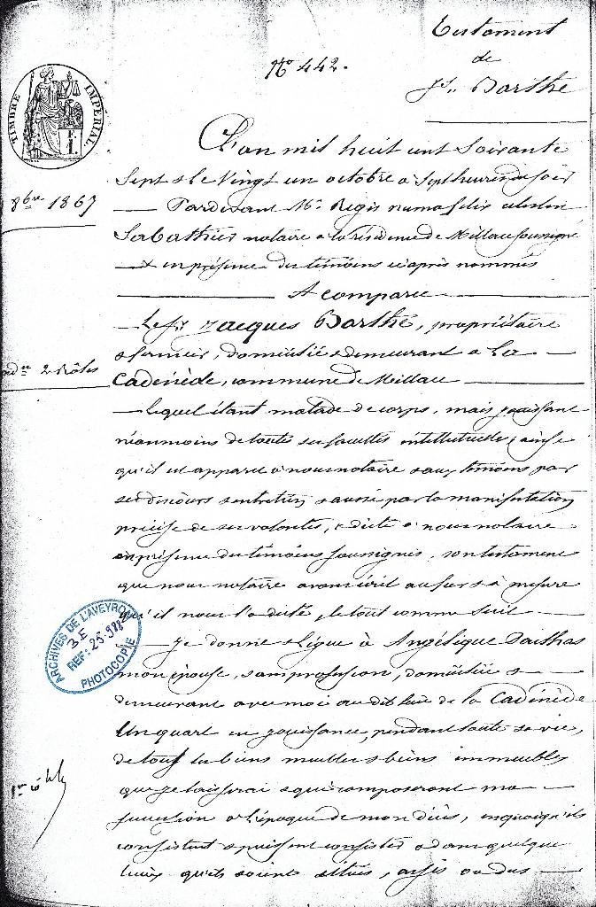 L’an 1867 et le 21 octobre à 7 heures du soir, par devant Me Régis Numa Félix Célestin Sabathier, notaire à la résidence de Millau, soussigné, en présence des témoins ci-après nommés
