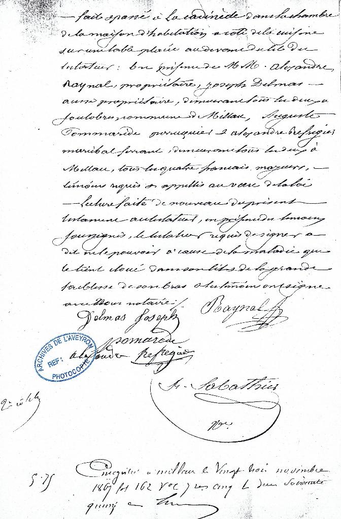 Fait et passé à la Cadénède dans la chambre de la maison d’habitation à côté de la cuisine sur une table placée au-devant du lit du testateur : en présence de Messieurs Alexandre RAYNAL, propriétaire, Joseph DELMAS aussi propriétaire, demeurant tous les deux à Soulobres, commune de Millau, Auguste POMMAREDE perruquier et Alexandre REFREGIER maréchal ferrant demeurant tous les deux à Millau tous les quatre français, majeurs, témoins requis et appelés aux vœux de la loi.