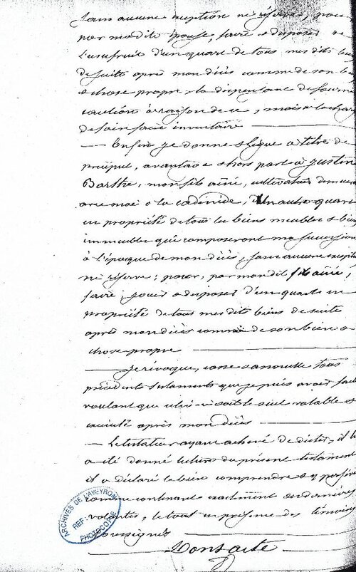 Enfin je donne et lègue à titre de préciput [1], avantage et hors part à Justin BARTHE, mon fils ainé, cultivateur, demeurant avec moi à la Cadénède, un autre quart en propriété de tous les biens meubles et biens immeubles qui composeront ma succession à l’époque de mon décès, sans aucune exception ni réserve : pour par mon dit fils aîné, faire, jouir et disposer d’un quart en propriété de tous mes dits biens de suite après mon décès comme son bien et chose propre.