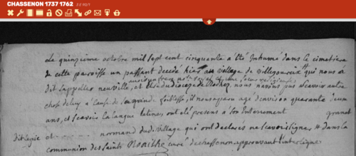 "Le quinzième octobre mil sept cent cinquante a été inhumé dans le cimetière de cette paroisse un passant décédé hier au village de Villegoureix# qui nous a dit s’appeller NEUVILLE, avoir un frère notaire royal et une soeur religieuse et être du diocèze de Rodhez. Nous n’avons pus scavoir autre chose de luy à cause de sa grande faiblesse, il nous a paru âgé d’environ quarante deux ans et scavoir la langue latine. Ont été présens à son enterrement GRANET dit Lepic et ....... NORMAND dudit village qui ont déclarés ne scavoir signer #dans la communion des saints