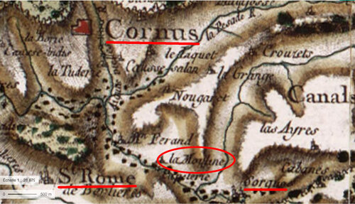 La Mouline, petit hameau situé dans le vallon, faisait partie de la paroisse de St-Rome de Berlières et resta liée à cette paroisse, même après son rattachement à la commune de Cornus. Cf. Google map ci-contre.