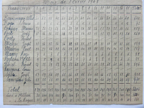 Il est tout à fait intéressant sur le plan généalogique de retrouver les noms des différents producteurs dans les archives. Ci-contre les "entrées de la première quinzaine de mai 1943" (merci de cliquer sur le document pour l’agrandir)