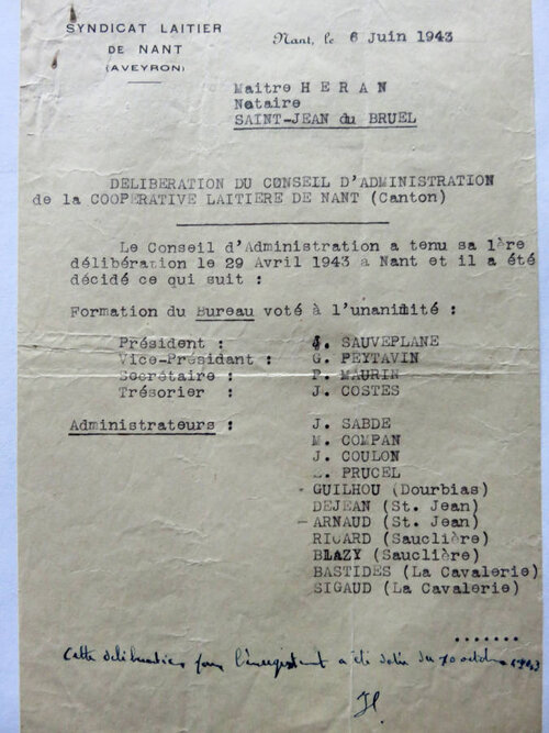 Le Conseil d’Administration de la coopérative laitière de Nant (Canton) a tenu sa première délibération le 29 avril 1943. Formation du bureau : Président [3] ; vice-président Gustave Peytavin ; secrétaire Paul Maurin ; trésorier Joseph Costes. Il y a 11 administrateurs. Les statuts ont été lus aux sociétaires le 16 mai 1943 par Me Joseph Héran. Tout sociétaire est tenu de souscrire une part au moins par vache ; la valeur de cette part est fixée à deux cents francs sur laquelle est prévu un intérêt annuel de 2 à 5 francs, suivant la décision du Conseil d’Administration. Le 2 août 1944, le capital souscrit est de 30 000 francs. (25 sociétaires de 1 part à 19 parts)