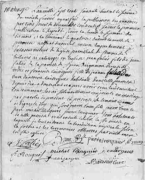 - Jeanne. Mariée à St-Rome de Berlières le 06.02.1768 avec Jean François ROUQUET, papetier, fils de François de la paroisse de St Georges de Juéry diocèse d’Albi.