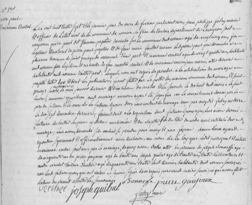 La filiation de Jean PAUL qui suit est un peu délicate à établir, car dans son acte de mariage il est dit : « fils de feu Jean et de feue Catherine MOUILLET ? (MOUISSET ?) de Bédarieux ». Nous pensons, néanmoins, qu’il ne peut être que le fils de Pierre et de Catherine SIMONNE, dont la mère porte le patronyme de MOUYSSET. D’autant plus, qu’à cette période là, il ne semble pas y avoir une autre famille PAUL à Bédarieux. [fond or] Nous formulons le souhait qu’un de nos lecteurs puisse nous éclairer sur ce point. Nous l’en remercions par avance. [/fond or]