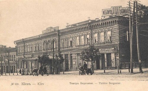 Comment ne pas évoquer Auguste BERGONIER [3], qui s’illustra à KIEV en construisant successivement un cirque bâti en bois, plusieurs immeubles, dont un théâtre, voué à l’art dramatique, lieu devenu célèbre et qui porta son nom. [4] Ci-dessous le Théâtre BERGONNIER en 1910.