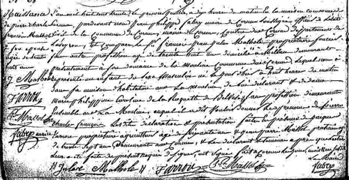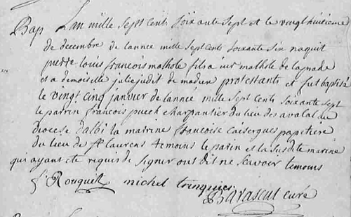 - IV - François MALHOLE, né le 31.10.1722. Bourgeois de Millau, marié à Castres le 05.08.1764 avec Judih Julie MADIERE († 31.07.1787), fille de feu noble Jean et de feue dame Marie BARREAU de CAMPOUILLET. D’où :