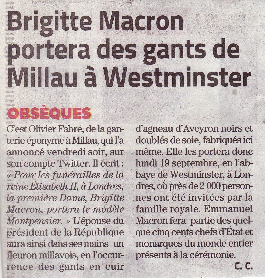 Lors des funérailles de la reine Elisabeth II, à Westminster le 19 septembre, le travail des gantiers millavois sera mis à l’honneur car l’épouse du Président de la République portera un fleuron du patrimoine millavois, à savoir une paire de gants fabriqués par la maison FABRE.