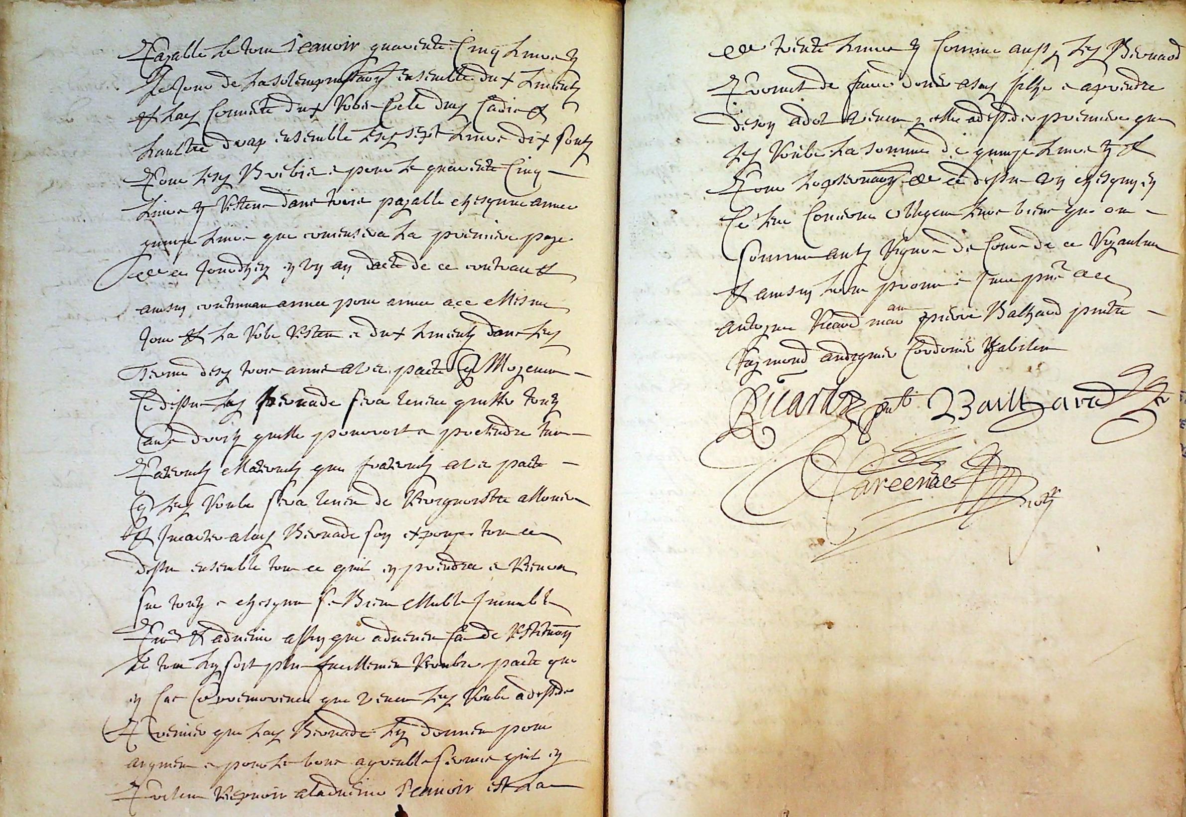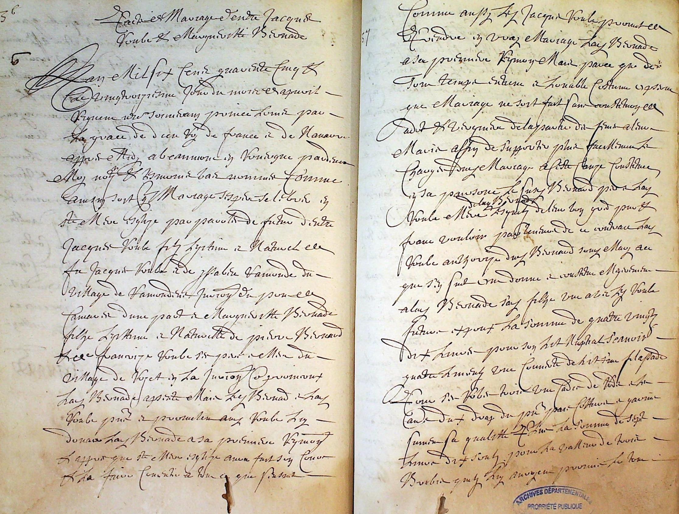 CM du 23.04.1645 de Jacques ROUVE, fils de feu Jacques et d’Isabeau RAMOND du village de Ramondens, juridiction du Pont-de-Camarès avec Marguerite BERNADE, fille de Pierre BERNARD et de Françoise ROUVE du village de Crouzet de la juridiction de Prohencoux.