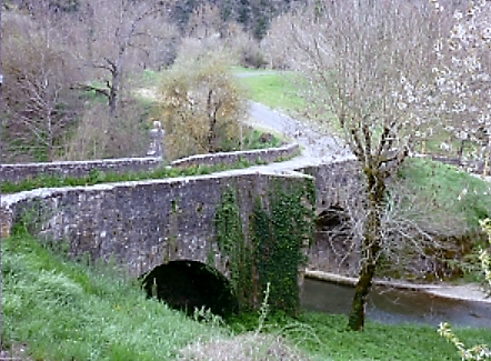 Nous noterons également le Pont médiéval sur le Cernon. Ce pont de calcaire d’une longueur de 30,20 mètres et d’une largeur de 2,70 mètres, possède deux arches, celle de gauche en plein cintre, celle de droite légèrement surbaissée. Il est composé d’une pile centrale avec avant et arrière-becs triangulaires, remontant jusqu’au parapet où ils font refuge. Ce pont est de la famille (en plus modeste) des ponts de Nant [5] de Trèves, de Vabres ou de Saint-Affrique. Une croix de pierre récente (1892) a été dressée sur l’avant-bec et porte le monogramme IHS. On remarque dans le bahut, à côté de la croix une cuvette régulière de 16 cm de diamètre formant un "bénitier".