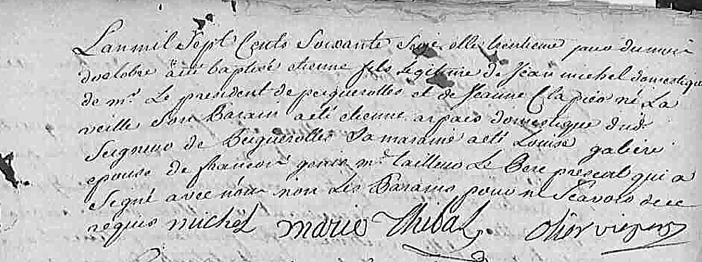 [rouge]IV. MICHEL Etienne,[/rouge]. Il naît à Millau le 29.10.1776. Son père est alors qualifié de "domestique de Monsieur le président DE PEGAYROLLES", et il signe. Signent également : DE PEYGUEROLLES, GENI. Le parrain est : ARPAIS Etienne domestique de Monsieur DE PEGAYROLLES. La marraine est : GALIERE Louise épouse François GENI maître tailleur de Millau.