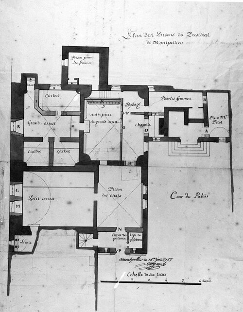 J’ai ainsi appris qu’auparavant, sous l’Ancien Régime, les prisons de Montpellier étaient situées au rez-de-chaussée du palais de la Cour des Aides et du Présidial, élevé en 1630 à l’emplacement du château seigneurial des Guilhem datant de 1143 et disparu en 1853, au moment de la construction du palais de justice actuel. Il n’en reste aujourd’hui plus rien, pas la moindre pierre sur laquelle je pouvais espérer rattacher une image de cette lamentable histoire. Grâce à l’aide de la documentaliste du Patrimoine Régional, j’ai pu avoir accès à un plan des prisons du présidial de Montpellier dressé le 15 juin 1755. Tout porte à penser qu’il correspond à l’état dans lequel se trouvaient encore les lieux en 1818. Pas de cellules individuelles, quatre grandes salles collectives voutées d’arrête recevaient les prisonniers dans une promiscuité malsaine et seule la salle dite du « grand-arrest » était divisée en trois cachots destinés probablement aux condamnés les plus dangereux. Le bas d’une ancienne tour carrée était affecté à la prison pour les femmes séparée du reste de l’établissement par la chapelle.