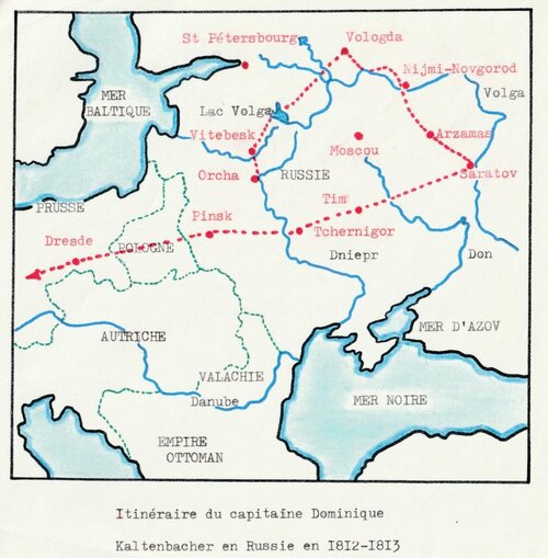 Le 24 avril 1813 il est formé un convoi de voitures pour les transporter vers le nord à raison d’étapes de 35 kilomètres par jour environ. Ils atteignent ainsi la Volga (cf carte). La population civile ne leur fait pas un trop mauvais accueil.