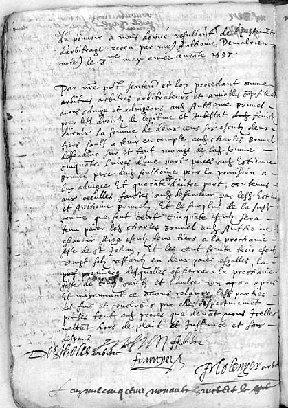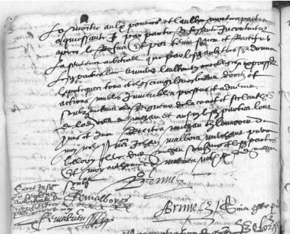 Aujourd’hui par la lecture de l’arbitrage de 1598, il semblerait que noble Charles Brunel puisse être le même que le fils et héritier de Jehan Brunel, lui même fils de Brenguier Brunel qui teste en 1553 (et lui même fils de Gérald Brunel et petit-fils de Laurens Brunel, c’est vous qui nous l’indiquez sans nous fournir pour l’instant de source supplémentaire précise concernant ces nouveaux personnages).