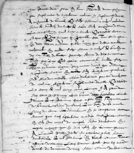 « par mesme droict que dessus à Pierre Louis, son filz légitime et naturel et de feue damoisselle Claire d’Auterives par ses droictz de nature légitime, suplément d’icelle, savoir la somme de 1500 livres t. à prandre sur tous et chescungz les biens du testateur tant donnés que retenus, tant à feu Jean Jacques de Brunel, sieur du Bruel, que Jean de Brunel, sieur du Bourc [6] co-donnataires (?), en se comprins les sommes que ledict testateur a cédé(e)s audict Pierre- Louis, son filz, sur Monsr de Campel, sieur d’Auterives, son nepeu, à charge que sy sondict filz soy treuvé gre… (?) à l’acord passé d’entre le testateur et ledict sieur d’Auterives, qu’il porsuive son droict comme vera (?) affaire, déclarant ladite somme porte par ledict acord deub (?) du douaire de ladicte Claire d’Aulterives [fol. 117], sadicte femme et mère audict (?) Pierre- Louis, bien que soict converty en debtes.