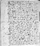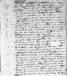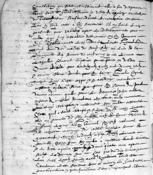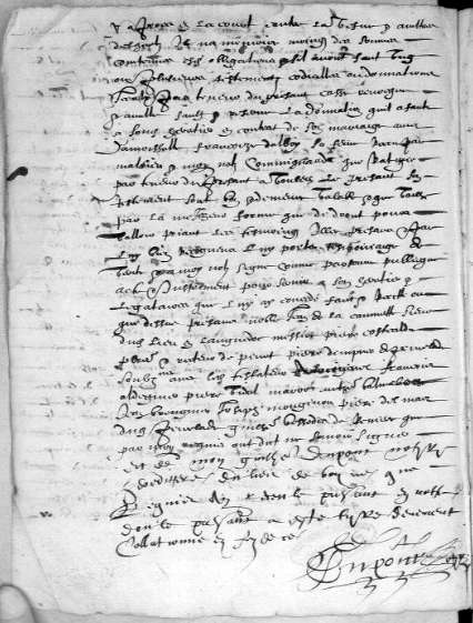 Pacte que ledict son filz ne poura demander aulx hoirs dudict feu sieur du Bruel que trois partz les deux dudict légat de 1500 livres et le reste sur les héretiers, paiable le tiers par sondict héretier deux ans après son décès la somme ou moitié dudict tiers et le reste dans trois ans après, bien qu’il soict estre tiré (?) de la maison par damoiselle Anne de Villeneufve, sa belle-sœur et vefve audict feu sieur du Bruel, et au regard de deux tiers du susdict légat veult luy soict paié par lesdictz hoirs par une fois après son décès, ce que ne poura obtenir sans procès, parce qu’aiant faicte ladicte donnation à sondict filz le Bruel soy treuvé ung artricle (?) [7] avoir transcript le fulhet par lequel y est mis que ledit testateur donnetous les ditz biens quittes sans nulle réservation et à suitte ont mis qu’il soy réservé vingt cestiers bled seigle pour en fère à ses plésirs, lesquelz, après l’avoir getté de la maison et constrainct soy retirer audit Peirelade à cauze des juornelles [8] ingratitudes, la première luy hostarent le pain blanc de m… (?) en soupant et de doutze cestiers bled qu’ilz luy restèrent ( ? restoient ?) la permière année s’en tirarent trois cartes de pières ; non comtent de ce et obliant toutes chozes, feut prié par sondict filz et sa feme à porsuibre son beau-père au paiement du douaire de ladicte Villeneufve du premier paiement de ladicte [fol. 117 vo] constition [9] feut constrainct alle(r) à ses despans trois fois à Quarcassonne [10] et deux à Tholoze où ladite Villeneufve soubtiendroict le contraire, consant que en soit crue à son sèrement, s’il n’a faict ladicte porsuitte avec proc… (?) après le désabonarent par aultre que ledict testateur dict avoir en son pouvoir ; et continuant lesdictz mariés leurs ingratitudes, aiant receu des mains de sondict filz au lieu de La Récuquelle [11] la somme de 1500 livres, lesquelles feurent enploiés pour paier ces debtes, comme résulte (?) par les agentz (?) qu’ilz ont devers heulx et comme estoint pourté par son livre journalié, lequel fulhet luy a esté coppé ; et en a obtenu monitoire, n’estant aultres fins que pour s’en servir du p… d’avoir donné quitte pour le ranvoier et les aultres enfens a… (?), remetant le tout aulx mémoires par luy escriptes et nottement par aultre testement clos qu’il a faict, escript et signé de sa main, l’aiant mis au pouvoir de feu Aigouy notaire de Boyne. »