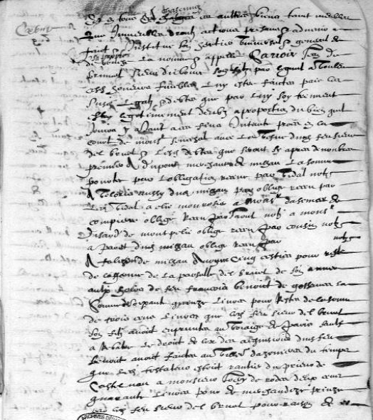 – Procès en la cour entre la veuve dudit feu sieur del Bruel et autres « desquelz il n’a mémoire », obligations, etc.