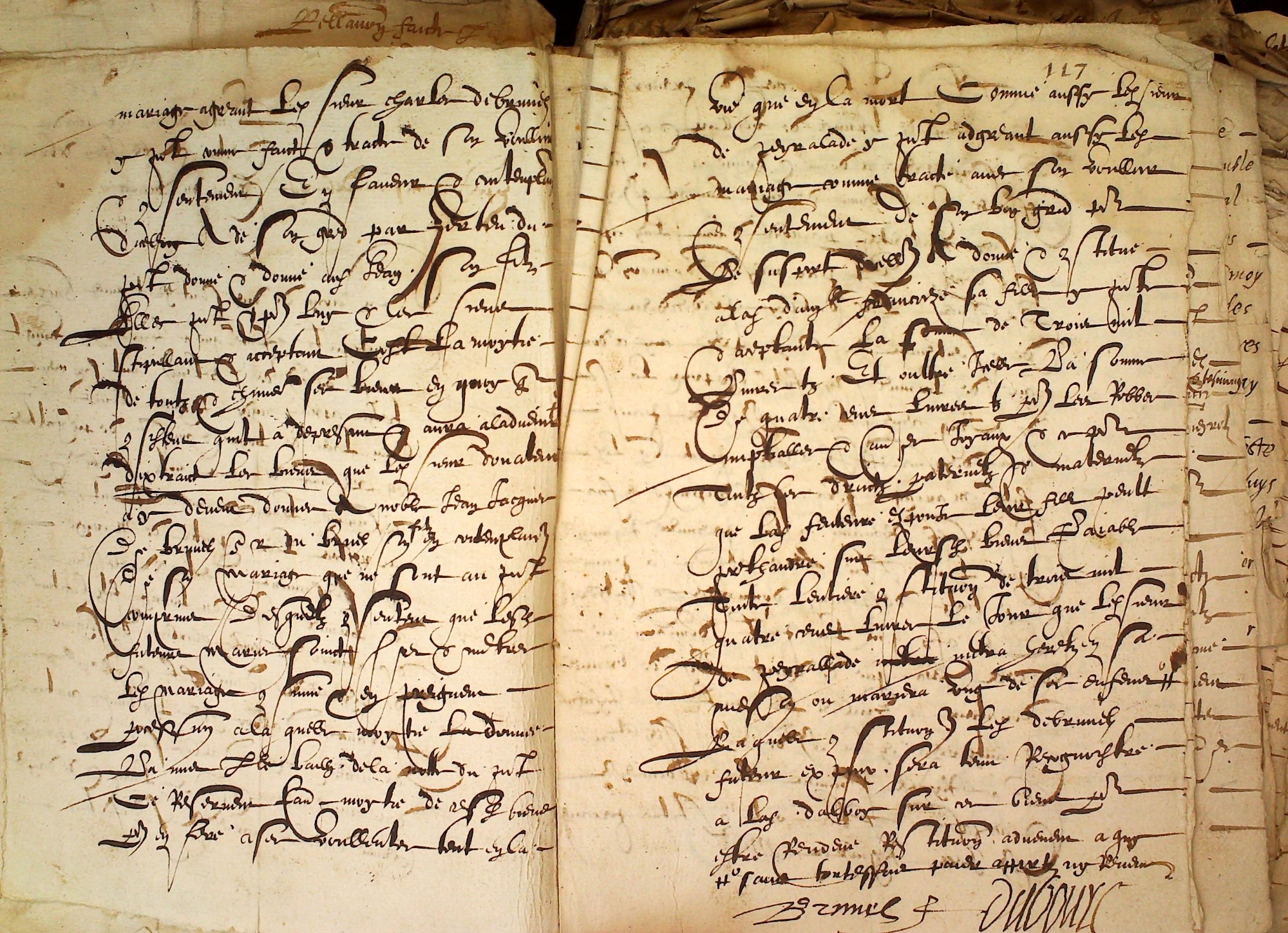 [Fol. 117 vo] En cas de prémorence, Jean de Brunel, du consentement de son père, donne à sa future épouse 1000 livres, et, si elle est prédécédente, ladite d’Alboy, future épouse, donne, du consentement de son père, à son futur époux la somme de 500 livres.