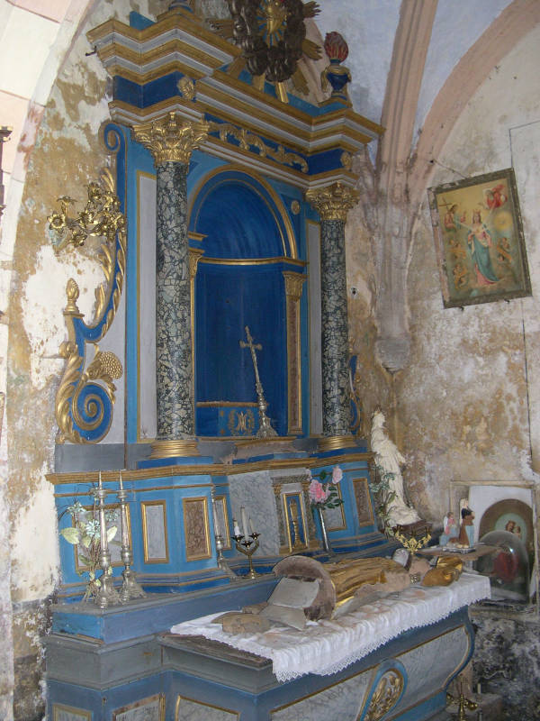 A l’intérieur il y a une chapelle, située à droite de la nef, dont j’attribue la fondation à mes ancêtres Mazeran et Bertrand au XVIe siècle. De même je sais par des testaments que certains y furent enterrés. Malheureusement il n’y a plus de traces visibles puisque le sol a été relevé au XIXe siècle pour lutter contre l’humidité. [1]