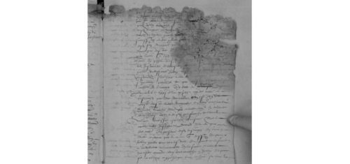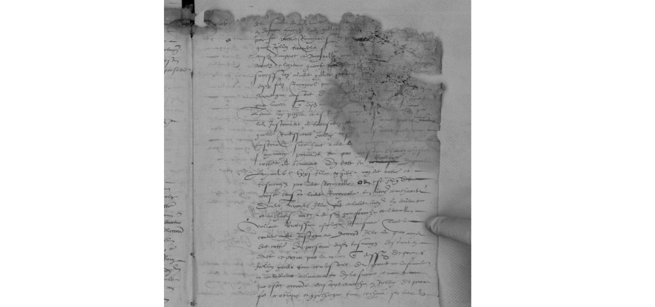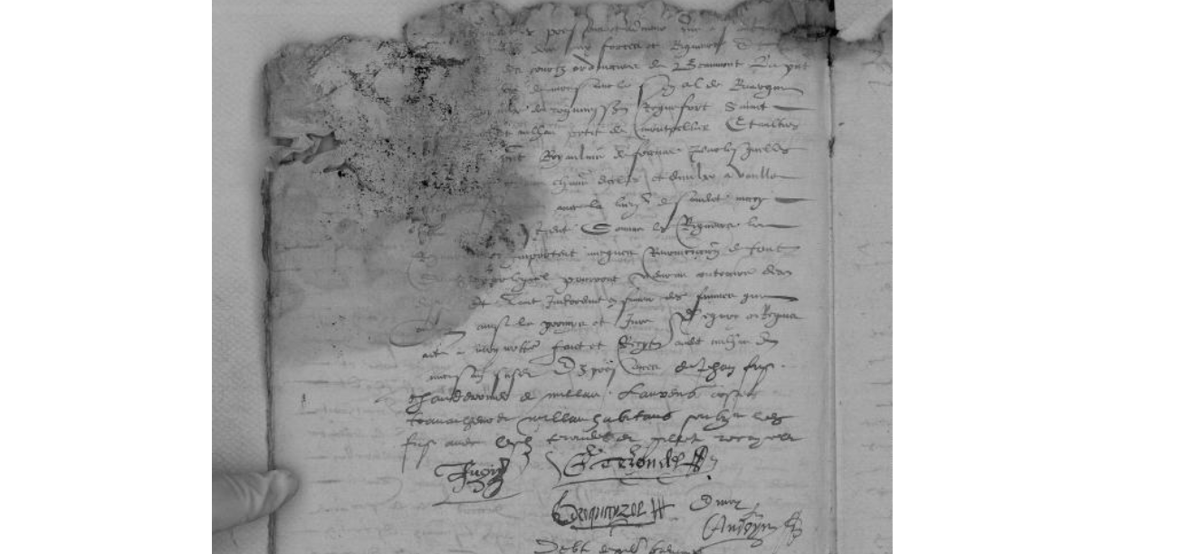La suite de l’acte est dégradée en grande partie par l’humidité. Il s’agit vraisemblablement de la succession de Pierre Rocayrol, père de Gilette. Mention d’un acte reçu par Me Thomas BASTIE notaire de Belmont en date du 13 avril 1571, copie présentée à Me Audoyn.