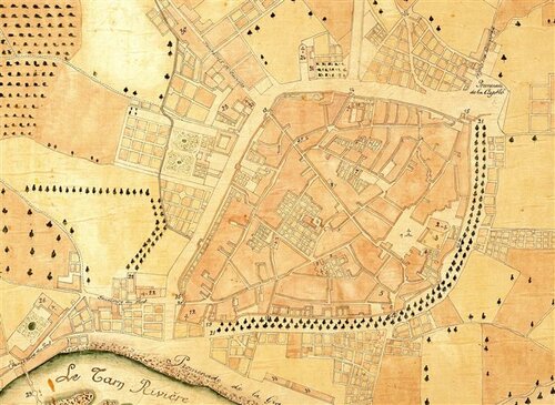 – 2, Un verger (viridarium) sis dans la douve (doga) du fossé (valatum), hors du portail de Fons major [10], confrontant au couchant avec la douve, au midi avec le verger de Johan Prades et au nord avec le verger d’Odon Bonnamici (?), marchand.