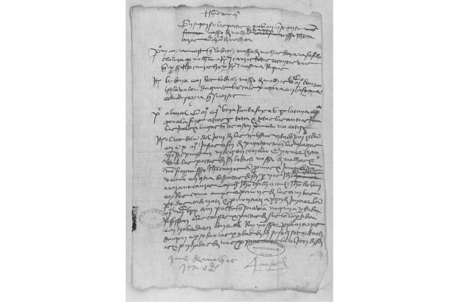 Nous avons noté la présence d’une feuille volante qui n’est pas sans intérêt, portant une ébauche de ce contrat. Cette page est rédigée en langue d’oc et semble avoir été écrite par les deux parties, Jacme ou Jacques de Malhac, de Nant, et Raymond Causac, de Millau. Nous en avons pour preuves deux mots personnels ( "mon frère Johan C." et "pour nous"), qui leur ont échappé et que le notaire n’aurait pas employés.