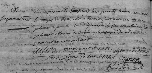– Haute et puissante Demoiselle Marie Françoise Honorée de BENAULT des LUBIERES de Roquemartine , fille légitime et naturelle de feu haut et puissant seigneur Messire Pierre Joseph Benault des Lubières, chevalier, marquis de Roquemartine, conseiller honoraire au parlement de Provence et de feue haute et puissante dame madame Thérèse Françoise de Brancas des Comtes de Forcalquier de la ville d’AIX, habitante depuis quelques temps de cette ville de St-Rémy, d’autre part.