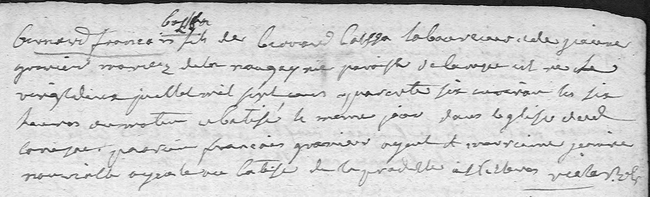 Bernard François BALSSA fils de Bernard BALSSA laboureur et de Jeanne GRANIER mariés de la Nougayrie paroisse de Canezac est né le vingt deux juillet mil sept cent quarante six …… baptisé le même jour dans l’église dudit Canezac parrain François GRANIER ayeul et marraine Jeanne NOUVIALLE ayeule ….. de la Pradelle illétrés.
