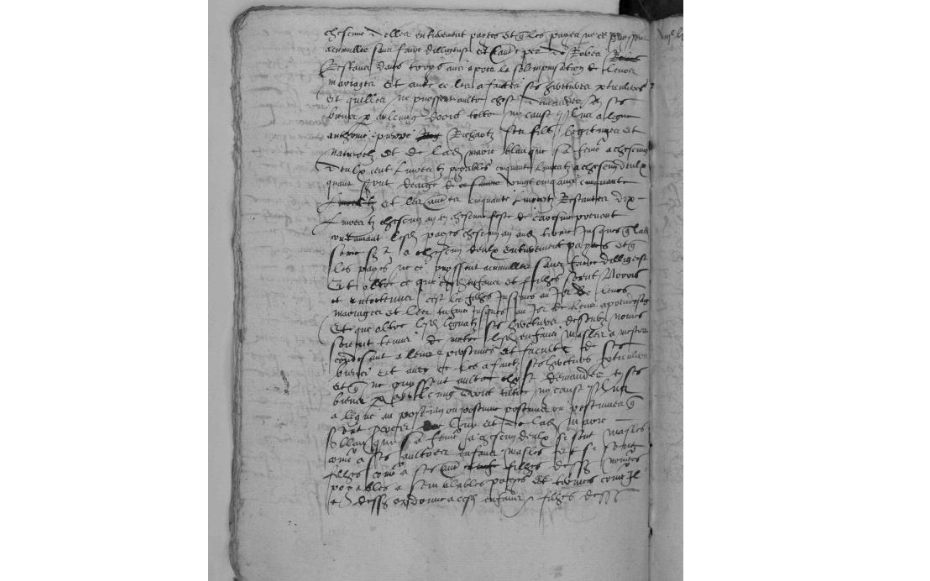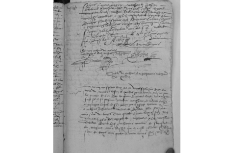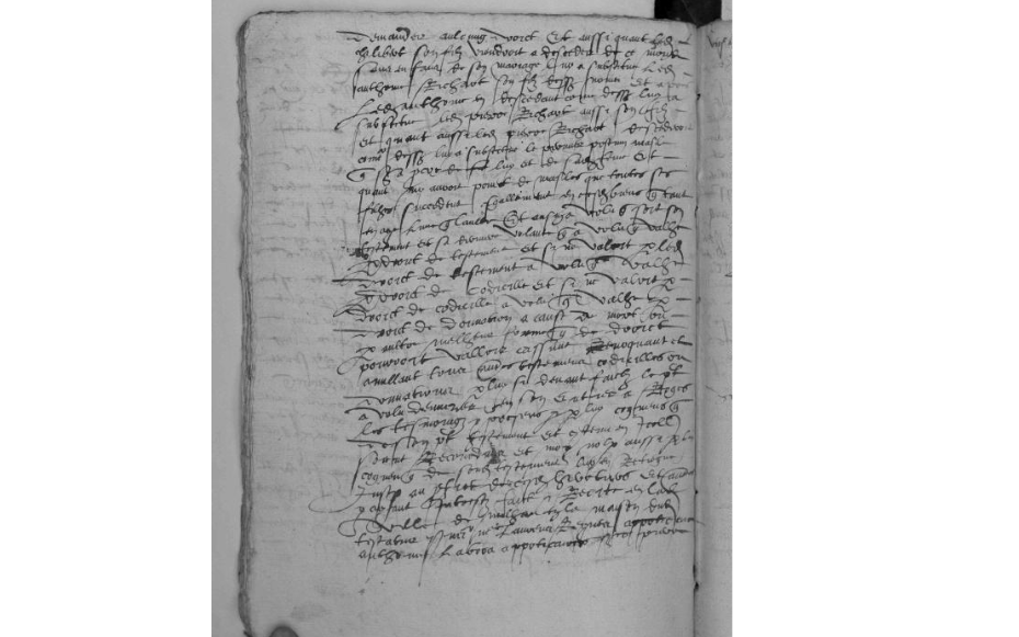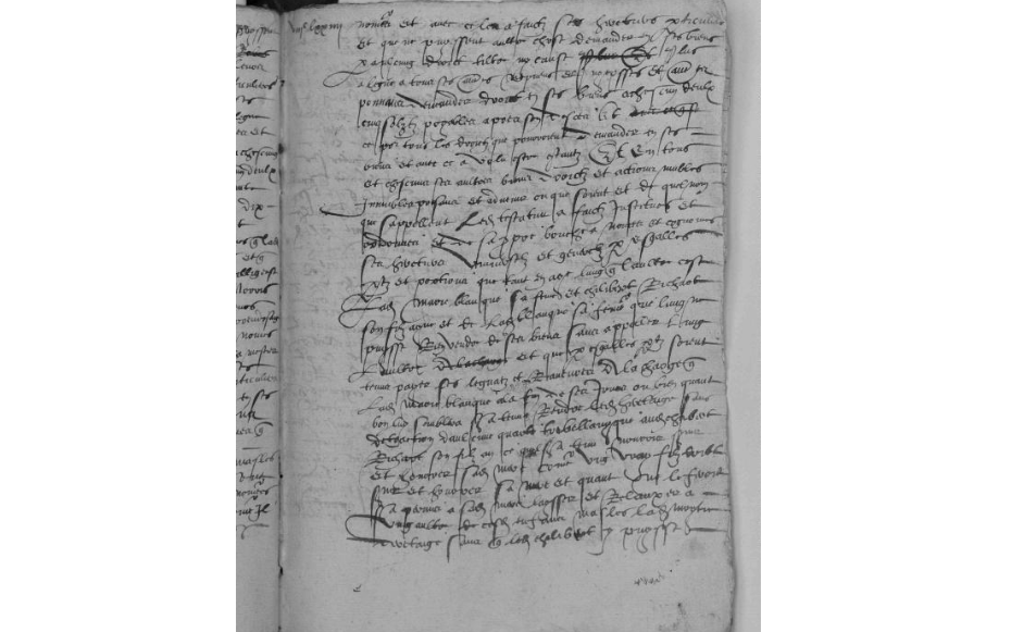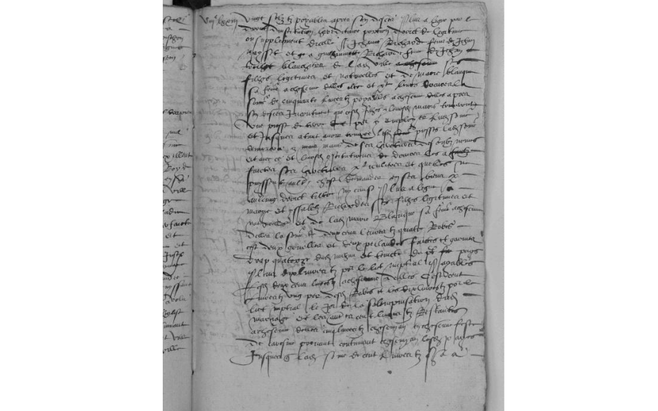 – Il institue ses héritiers universels par égales parts et portions Marie Blanque, sa femme, et Chilibert (sic) Richart, son fils aîné, que l’un ne puisse rien vendre de ses biens sans en appeller [9] l’autre, et que par égales parts ils soient tenus de payer leurs légats et rancures [10], « à la charge que ... Marie Blanque, à la fin de ses jours ou bien quant bon luy semblera, sera tenue rendre ledit héretaige, sans détraction d’aulcune quarte trébellanyque [11] audit Chabert (sic) Richart, son filz, et qu’il sera tenu nourrir, servir et honorer sa mère et quant ne le feroit, sera permis à sa mère laysser et relauxer à ung aultre de ces enfans masles la moytié d’éretaige, sans que ledict Chalibert (sic) y puysse [fol. 874 vo]
