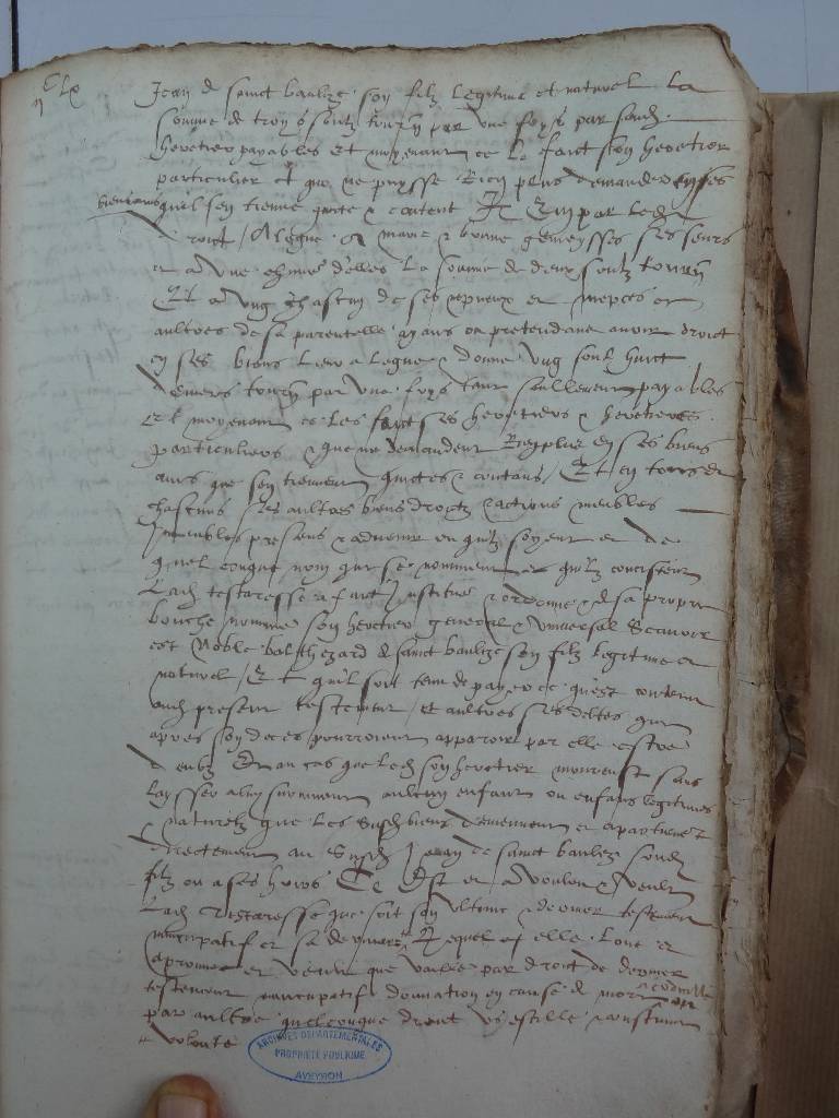 [Fol. 260] - Elle lègue à noble Jean de Sainct-Baulize son fils 3 sous tournois, le faisant son héritier particulier. Nous noterons que Jean lors de mariage en 1572 se déclarait de la Religion Prétendument Réformée.