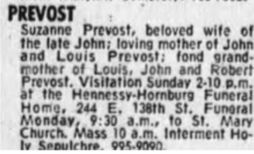 « PREVOST – John R. Prevost, domicilié au 320 W. 107th Street, époux dévoué de Suzanne ; père aimant de John C. et Louis M. ; grand-père de trois enfants. Repose à la morgue, 12 E. 112th Place. Funérailles mercredi à 9 h, à l’église slovaque du Saint-Rosaire ; messe à 9 h 40. Inhumation au Saint-Sépulcre. » [9]
