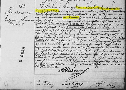 Nous ne trouvons aucune trace du mariage RIGGITANO x FONTAINE ; l’acte de naissance de Suzanne ne comporte aucune mention marginale. Ceci peut tout à fait s’expliquer en raison d’une part de l’éloignement géographique et d’autre part de la période de guerre en France.