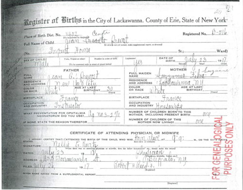 Leur premier fils John Centi [3] PREVOST voit le jour le 23 juillet 1917 à Lackawanna, Erie County, New York, Suzanne a 23 ans. L’acte de naissance comporte de nombreuses ratures et incohérences… [4]