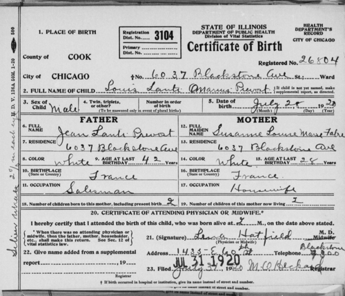 Puis un second bébé arrive le 28 juillet 1920. Louis Santi Marius PREVOST voit le jour 6037 Blackstone Ave - Chicago, Cook County, Illinois. Ses parents, Salvatore Giovanni RIGGITANO et Suzanne FONTAINE ne sont toujours pas mariés. A cette époque, RIGGITANO était encore marié à Daisy HUGHES. Néanmoins, l’acte de naissance de ce second fils (qui sera le père de Léon XIV) est beaucoup plus clair !