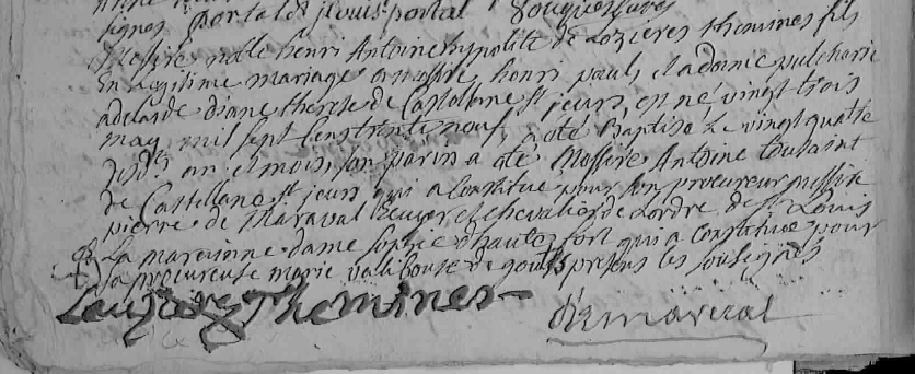 Parrain : Messire Antoine Toussaint de CASTELLANE ST JEAN - qui a constitué pour son procureur Messire Pierre de Maraval, écuyer et chevalier de l’ordre de St Louis.
